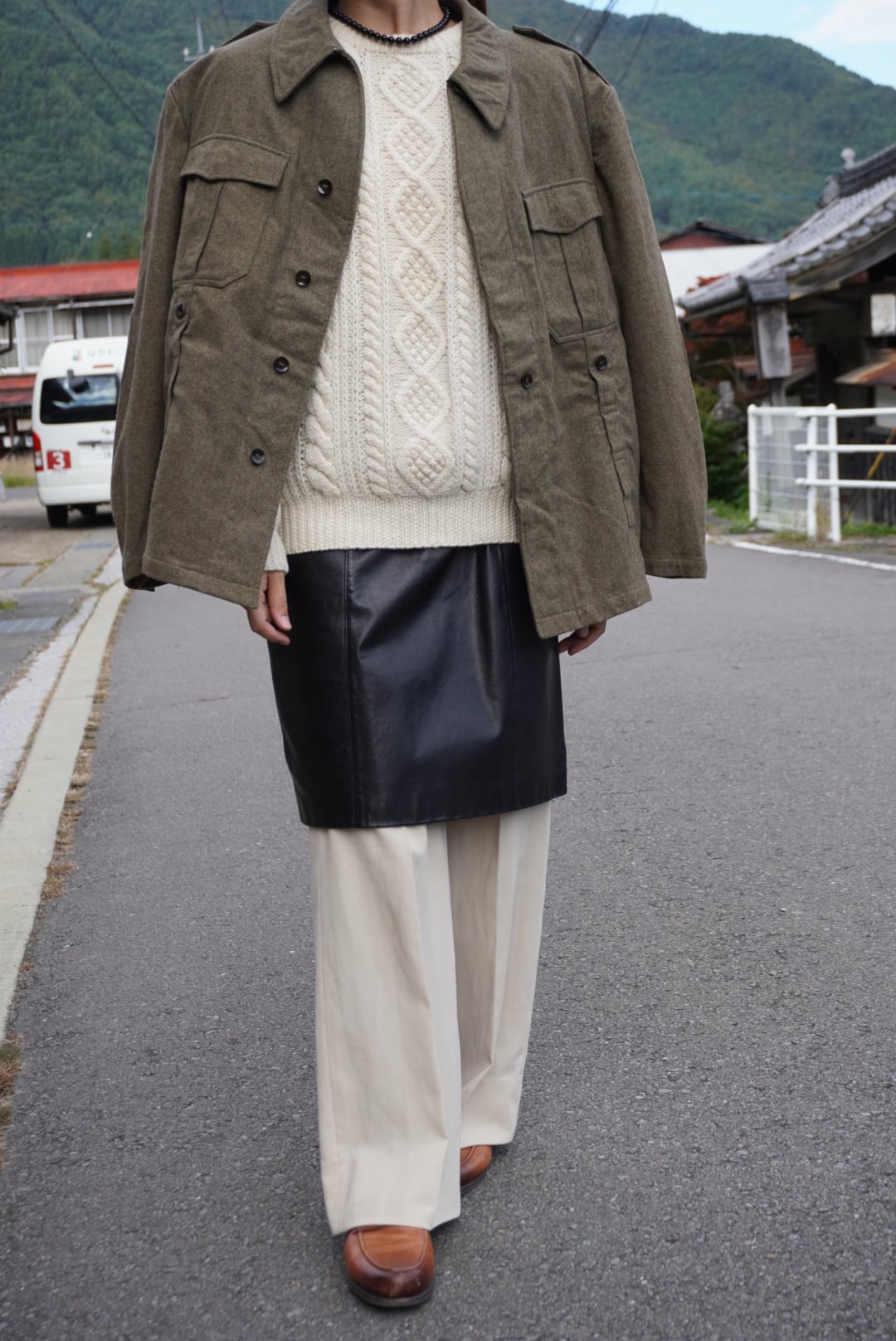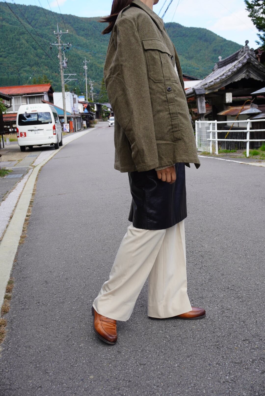 遠目で見るとカーキ色ですが、近くに寄って見るといろんな色味が複雑に混ざり合っていてニュアンスがあるのがわかります。