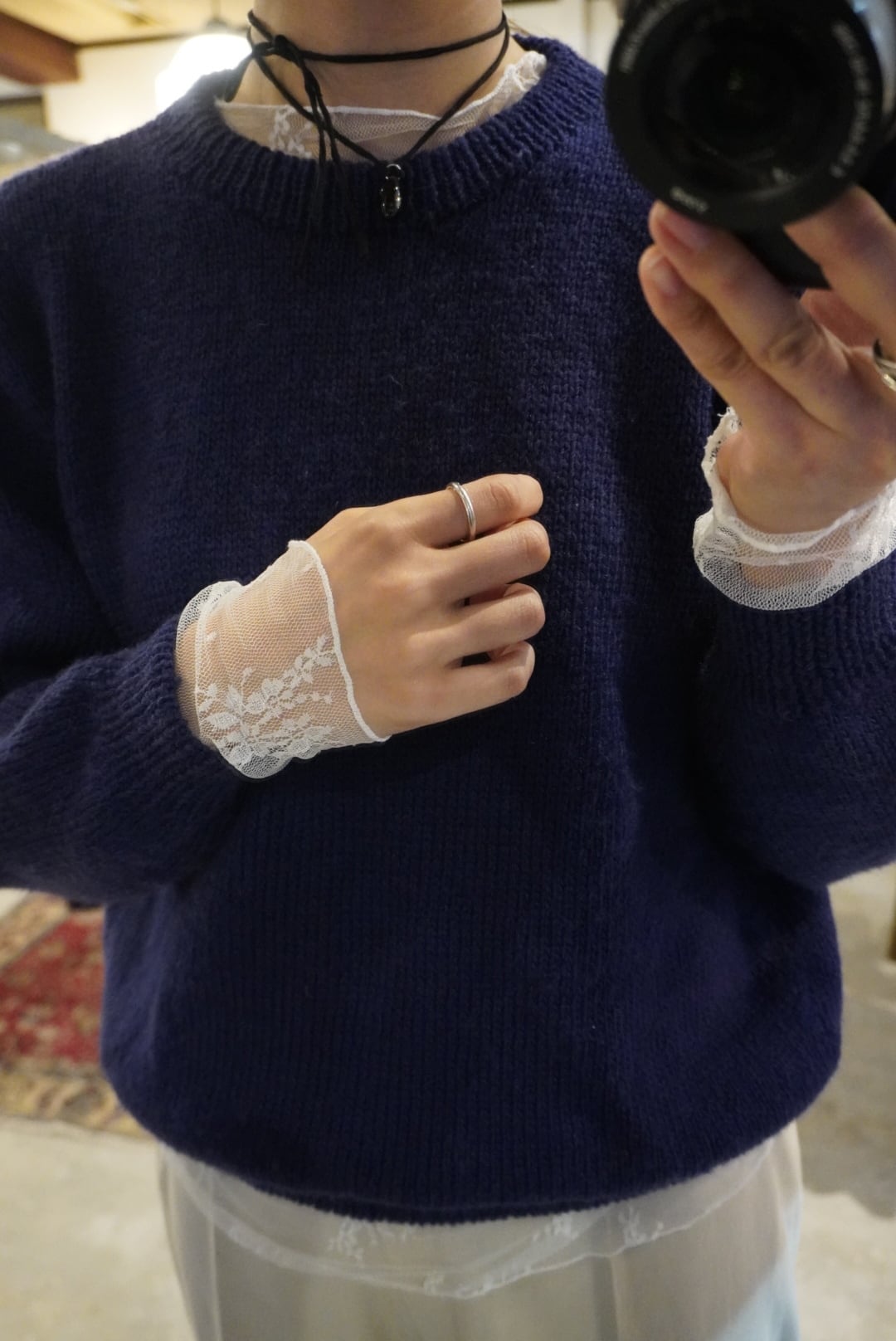 首まわりがこれまた絶妙な空き具合で、詰まり気味のクルーネックニットの襟からもチラ見せできるお利口さん。